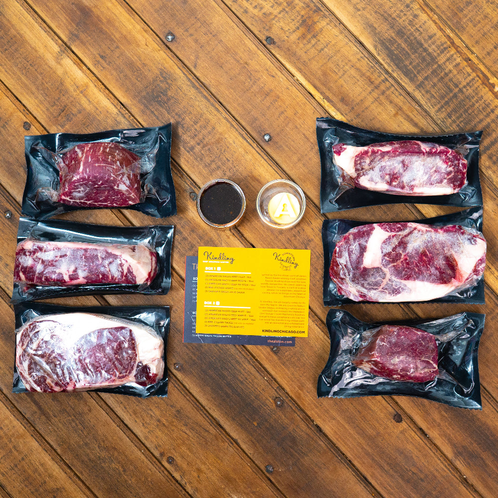 This includes: (2) AMERICAN WAGYU BEEF FILET - 8oz (2) AMERICAN WAGYU BEEF RIBEYE - 16oz (2) AMERICAN WAGYU BEEF NY STRIP - 14oz (1) MRS. O'LEARY SAUCE (red wine demi-glaze) (1) SAWYER'S GREEN ZHUG SAUCE